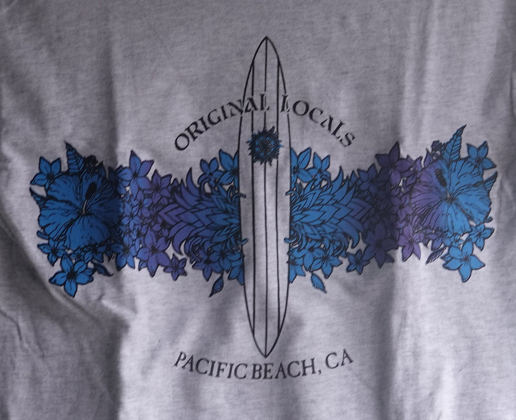 Long sleeve tee featuring artwork of a surfboard with flowers around it on the back and our PB Surf Shop original logo on the front left breast panel.