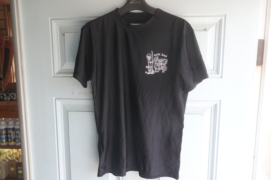 Black rashguard with PB Surf Shop white original logo printed small on the chest and larger on the back.